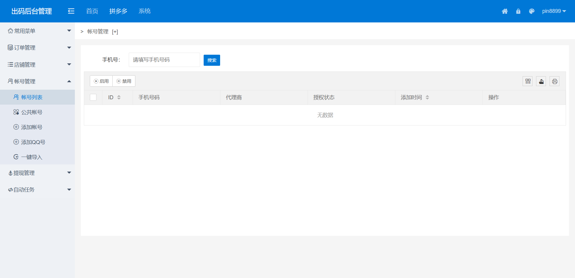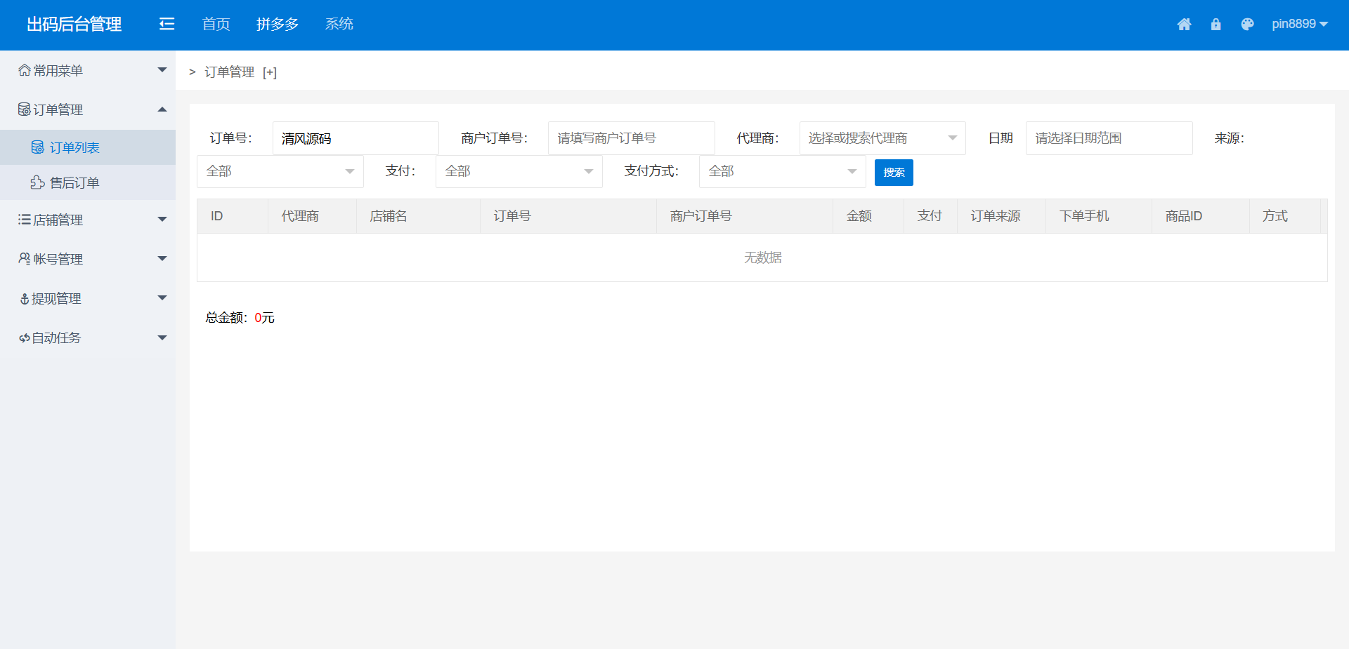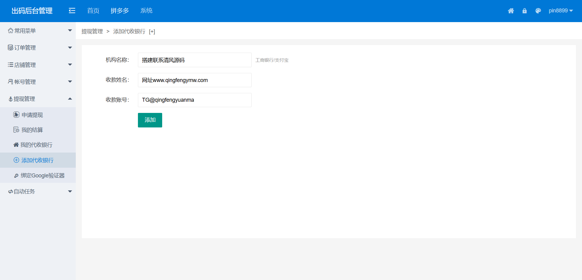 本系统为拼多多出码通道定制化支付解决方案,集成PC端实时监控、授权端程序与自动化运营模块。系统支持多账号轮询出码,实现支付流程全自动化管理,适用于四方支付业务场景。