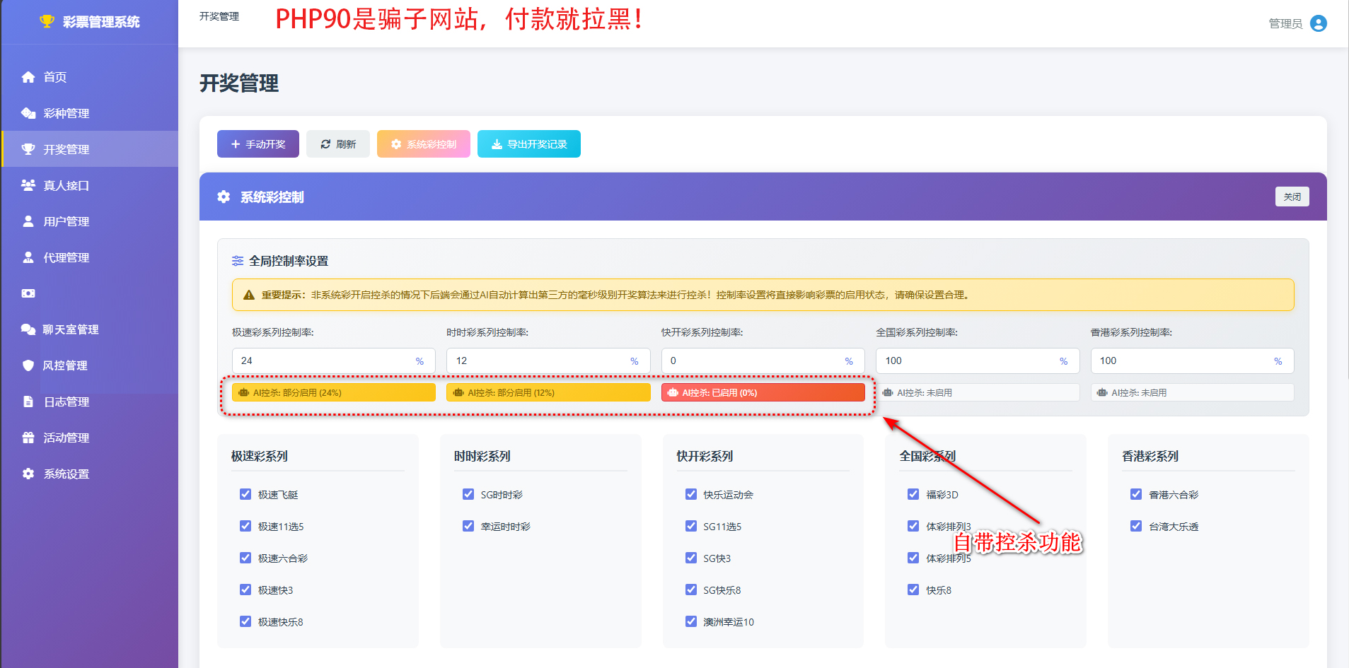 他这套程序设计的控杀是后端使用的AI算法进行控制的,声明了可以做到哪怕是第三放的彩种也可以做到控杀。