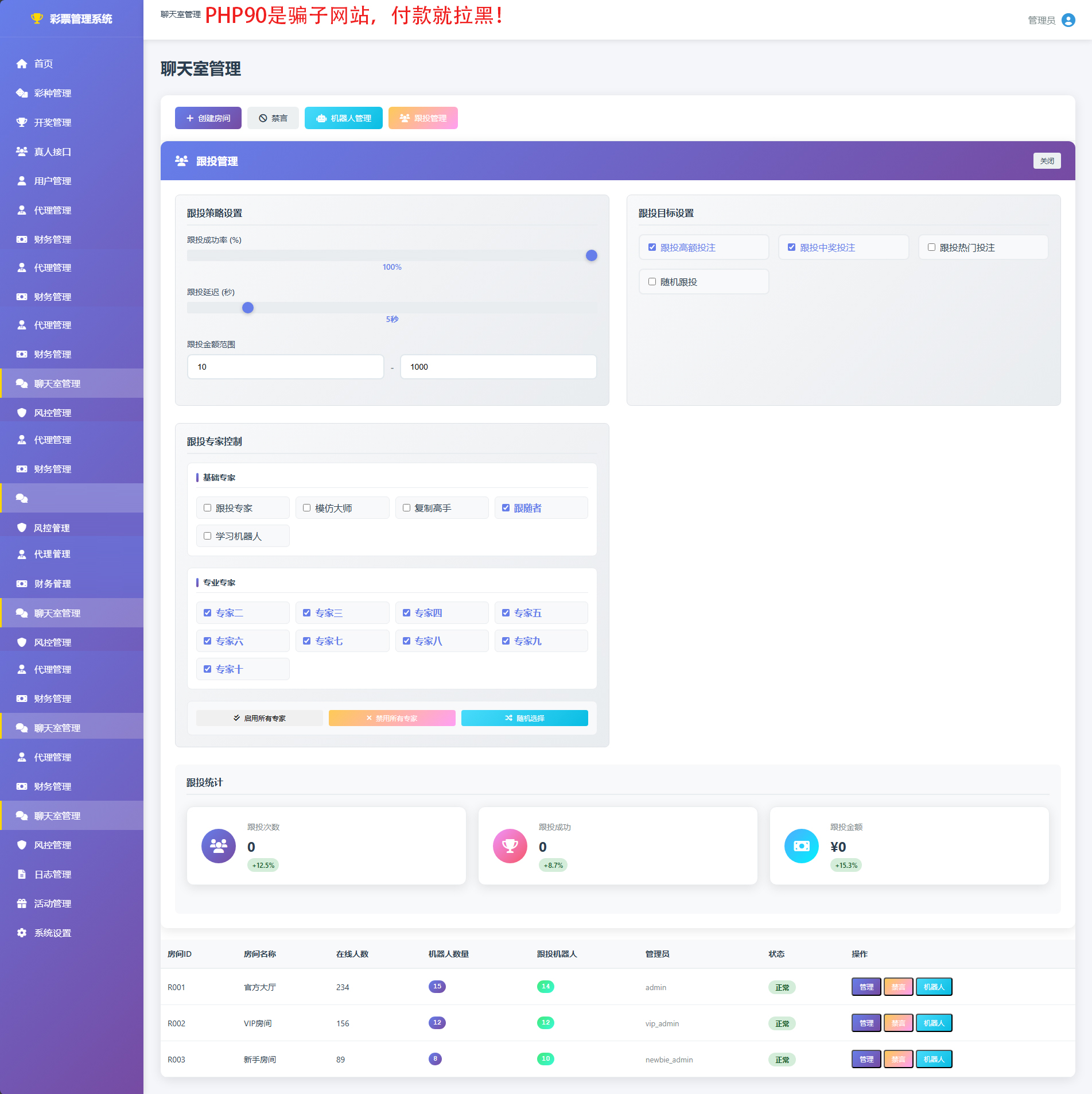 非常完美的一套程序,亮点就是聊天室的跟投功能,另外后台还可以对跟投机器人进行控制。